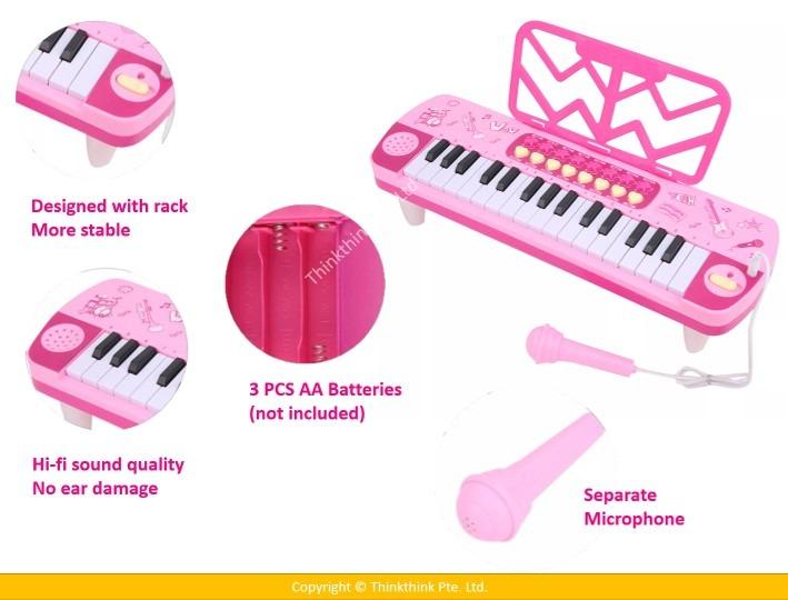 ? Multiple functions, 32 piano keys, 4 different rhythms, separable microphone, 4 musical instruments sound, and 4 styles of meter.