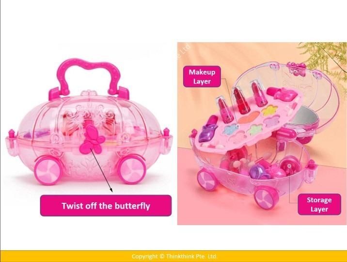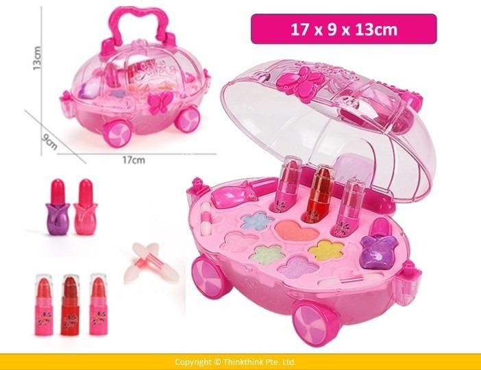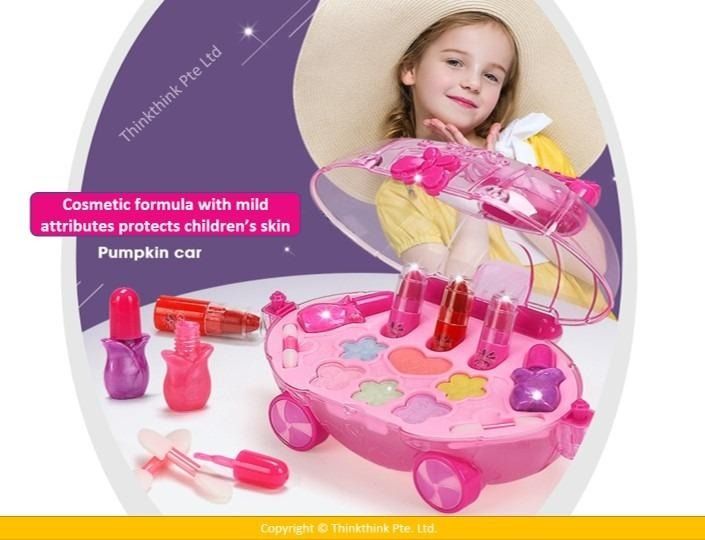 ❀ Includes: real cosmetics 6 eyeshadow and blush, 3 lipsticks, 2 makeup swab brush, and 2 nail polish, all in cartoon pumpkin cart shape makeup case.